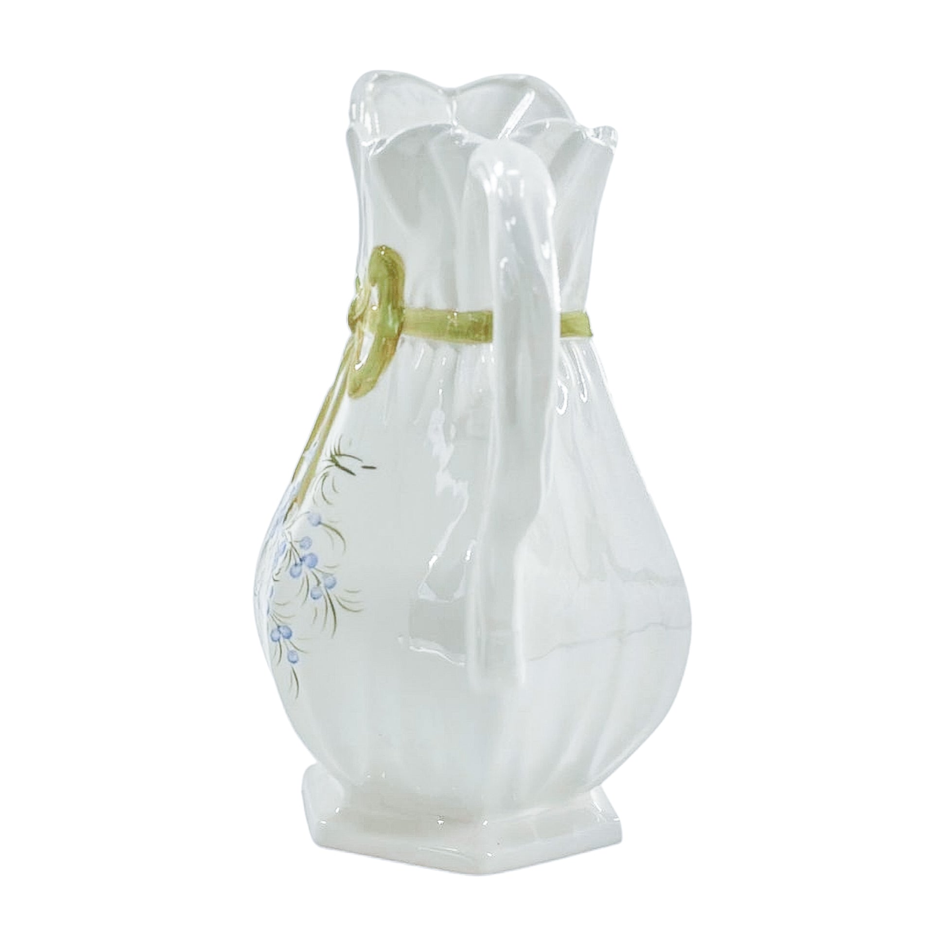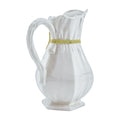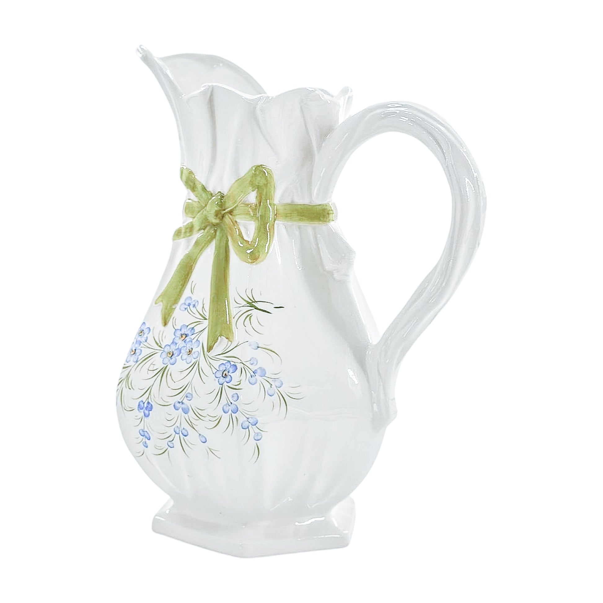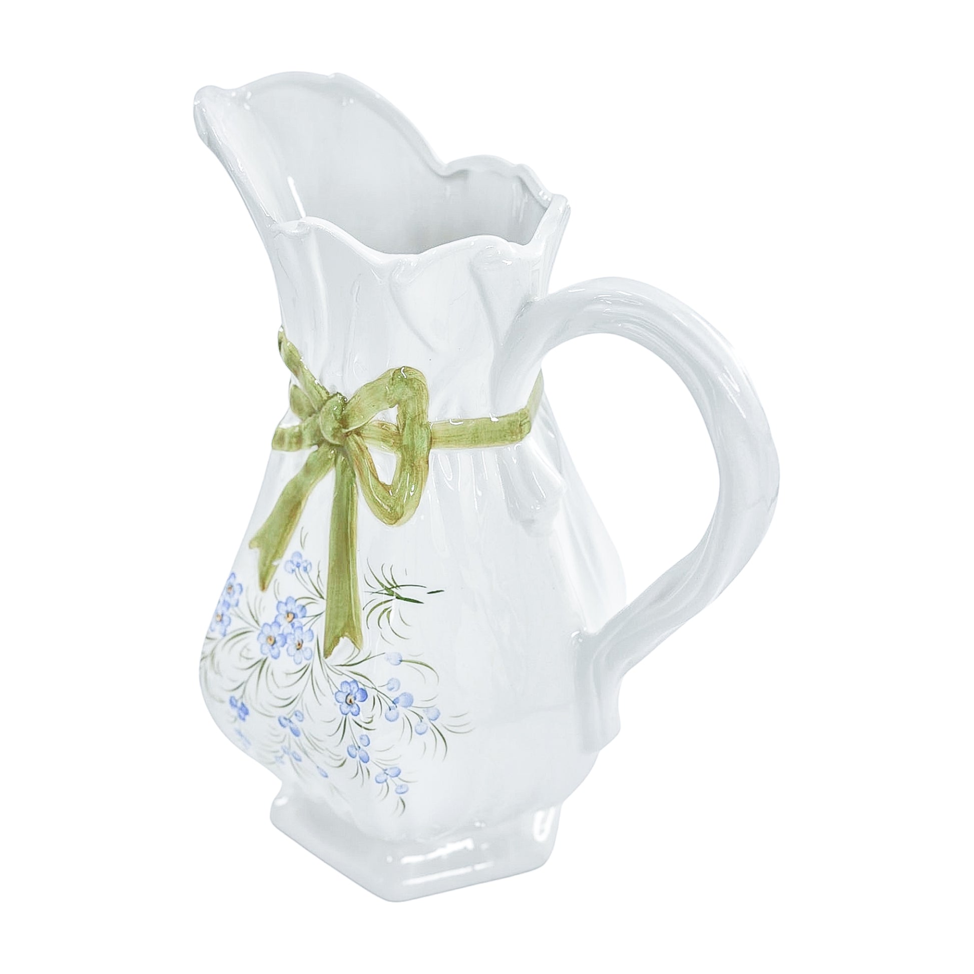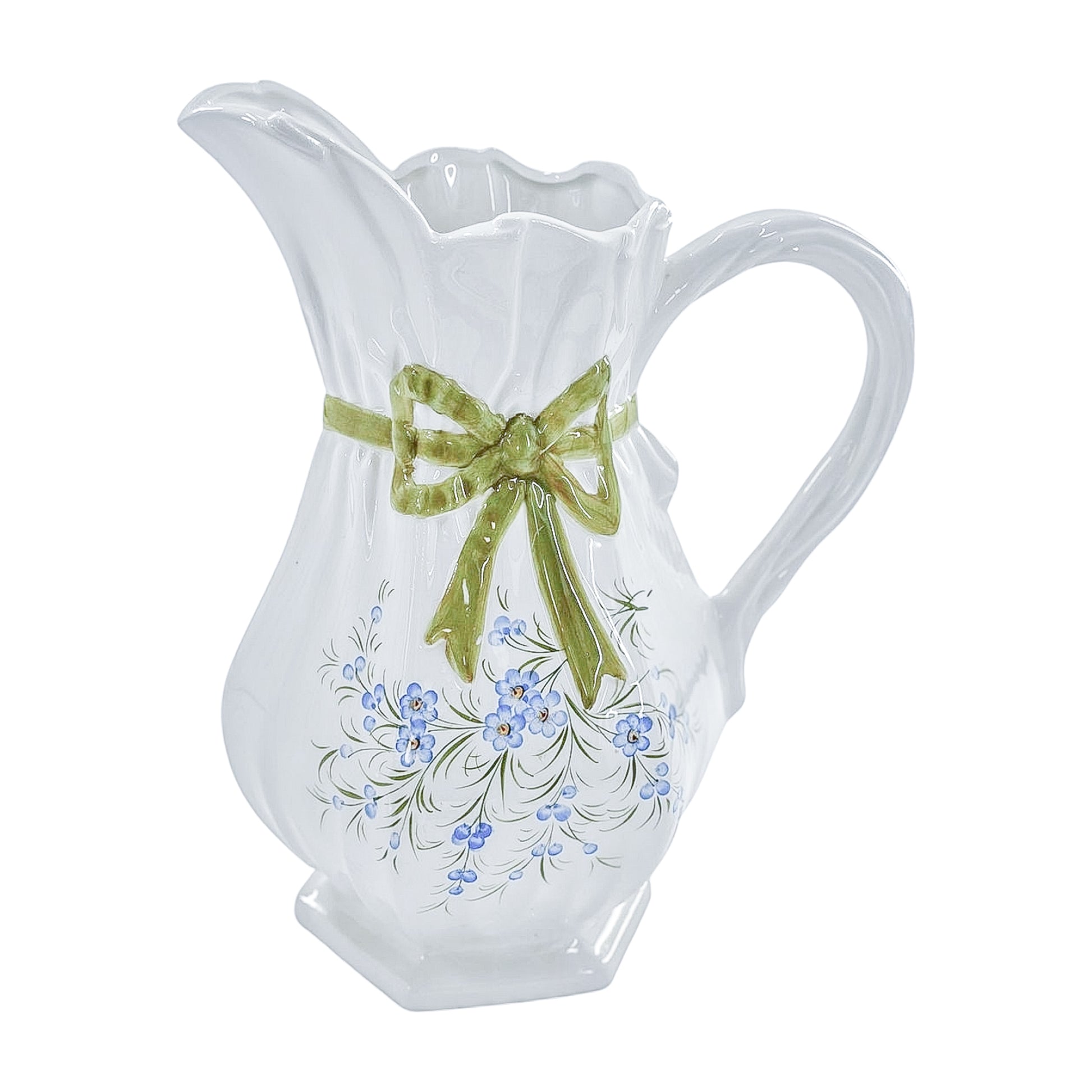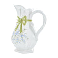 An Italian-style porcelain pitcher with a sculptural green bow, soft blue florals, and scalloped edge. The crisp white glaze and charming details make this piece versatile — lovely used for serving or as a vase.