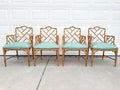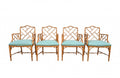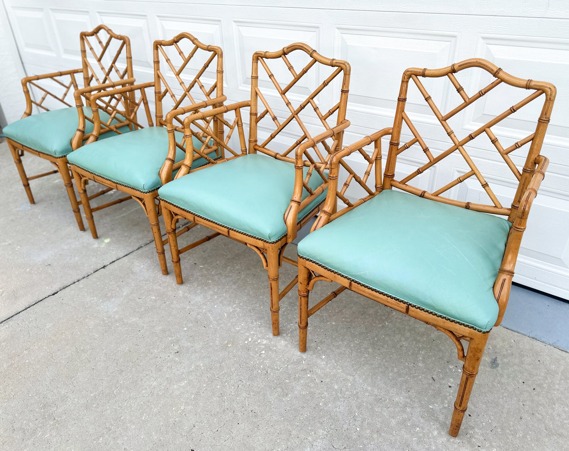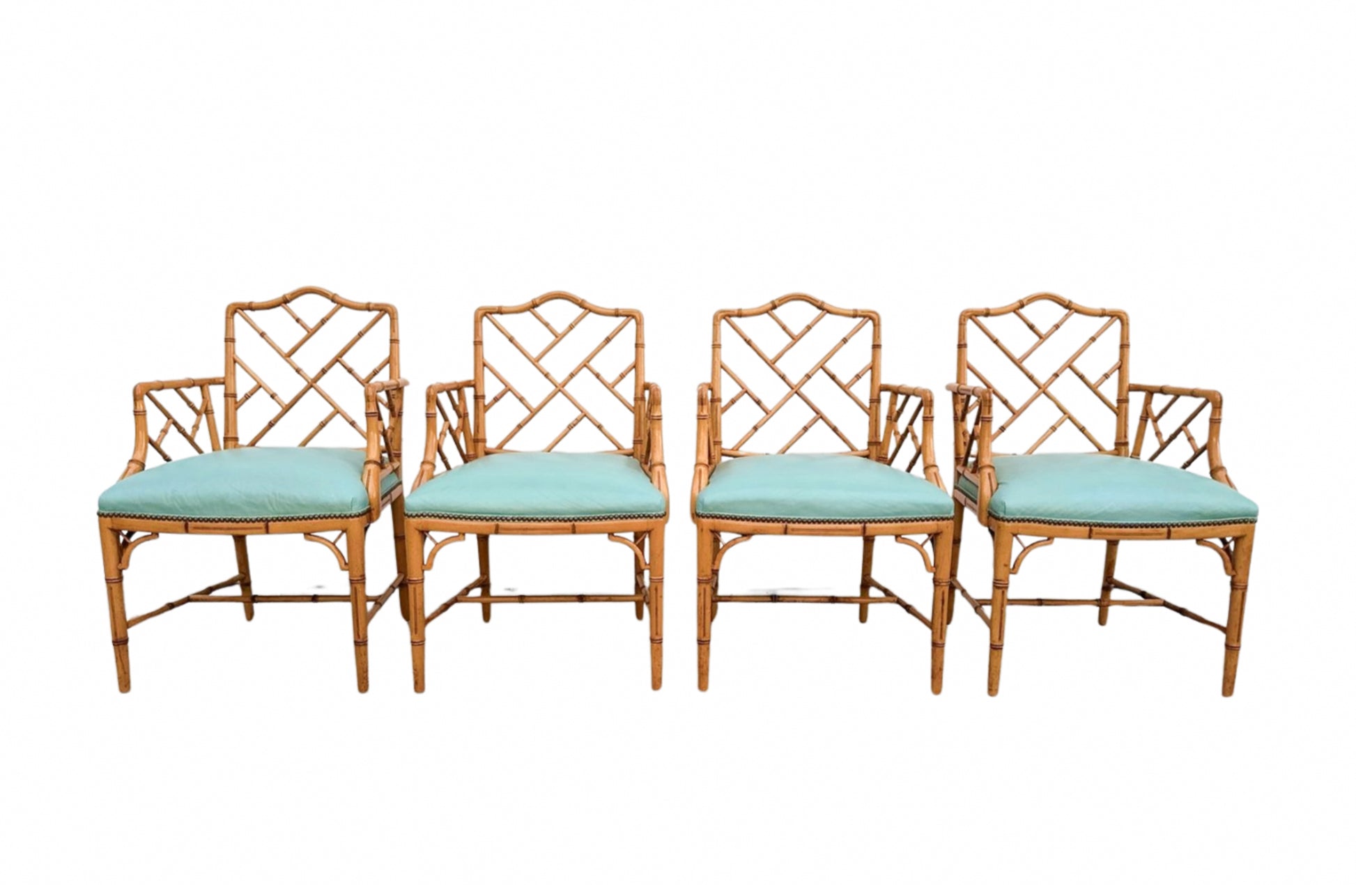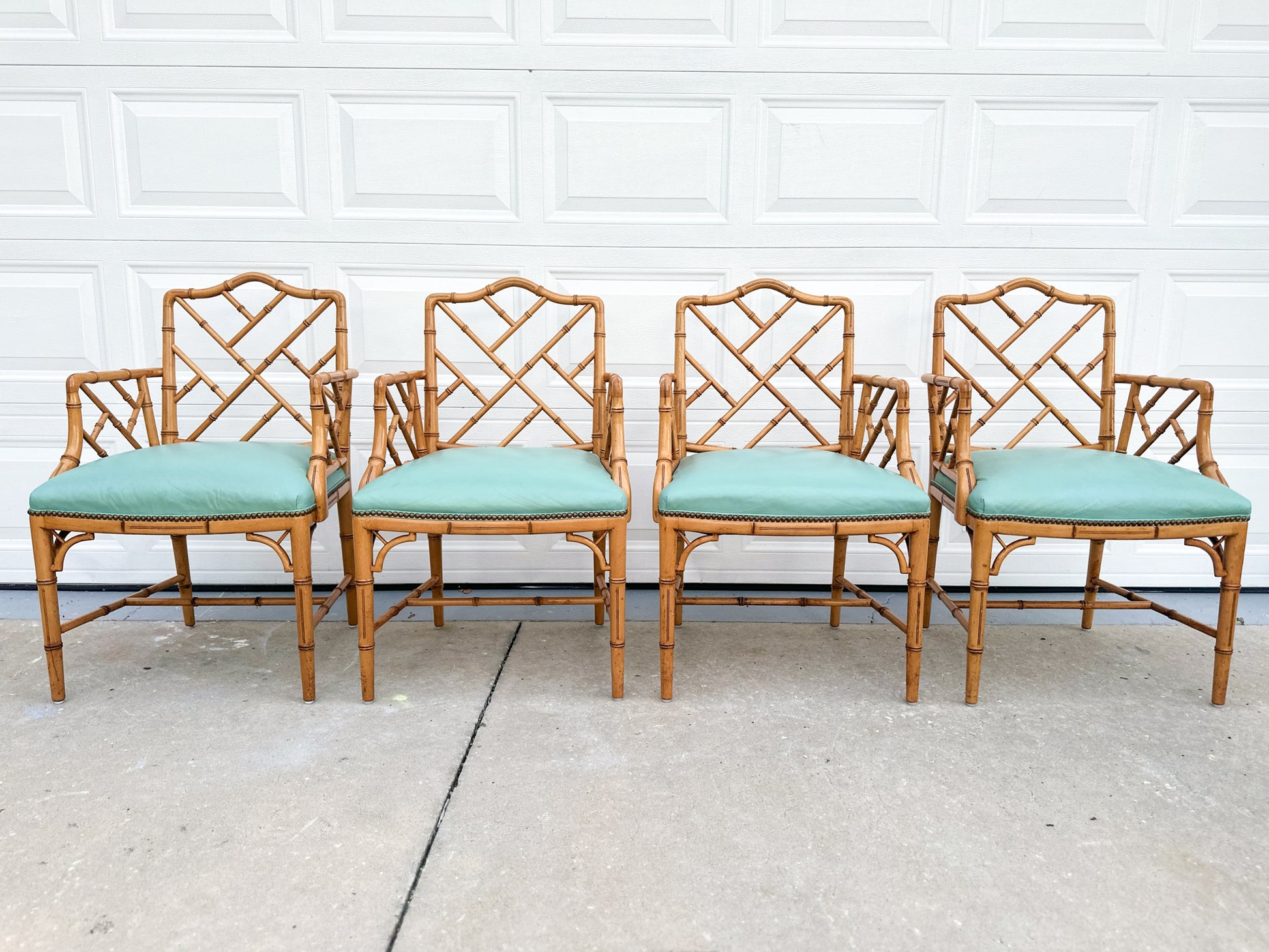 Chippendale lines meet a mid-century palette. This set of four Century Furniture armchairs features carved faux bamboo frames in a warm honey-toned finish, paired with teal leather seats and nailhead trim. The shape is classic—crisp fretwork backs, graceful arms, and squared-off legs—but the color keeps things from feeling too polite. Equally at home around a table or flanking a console.