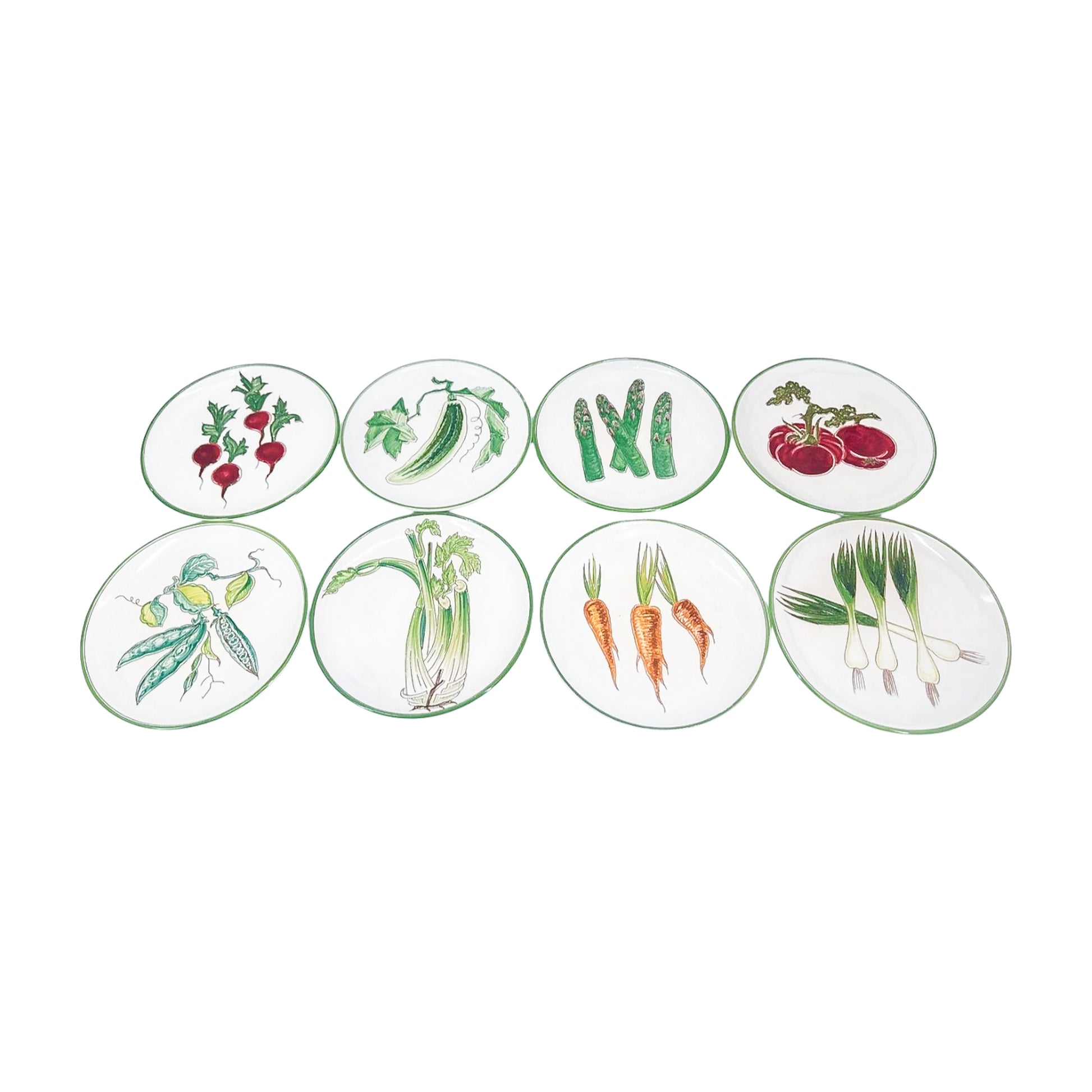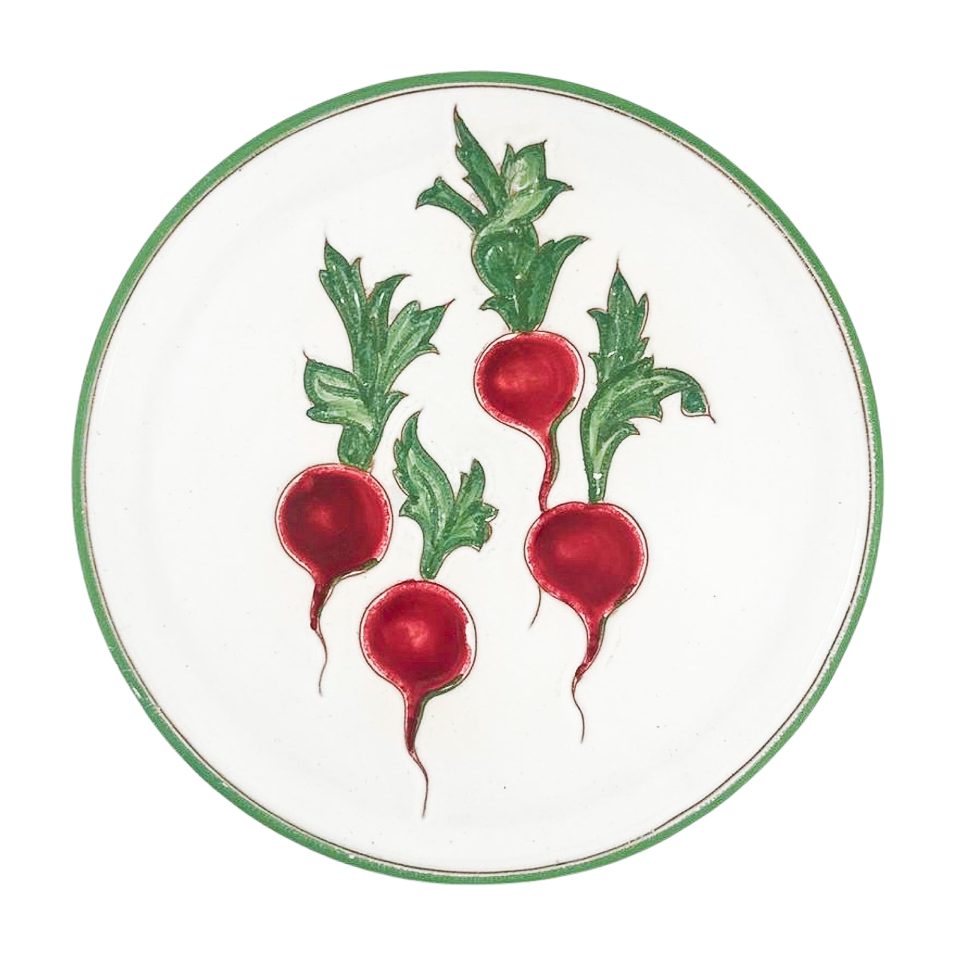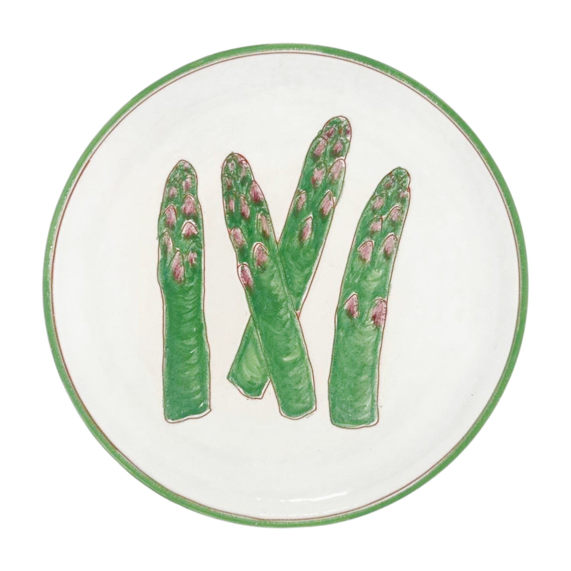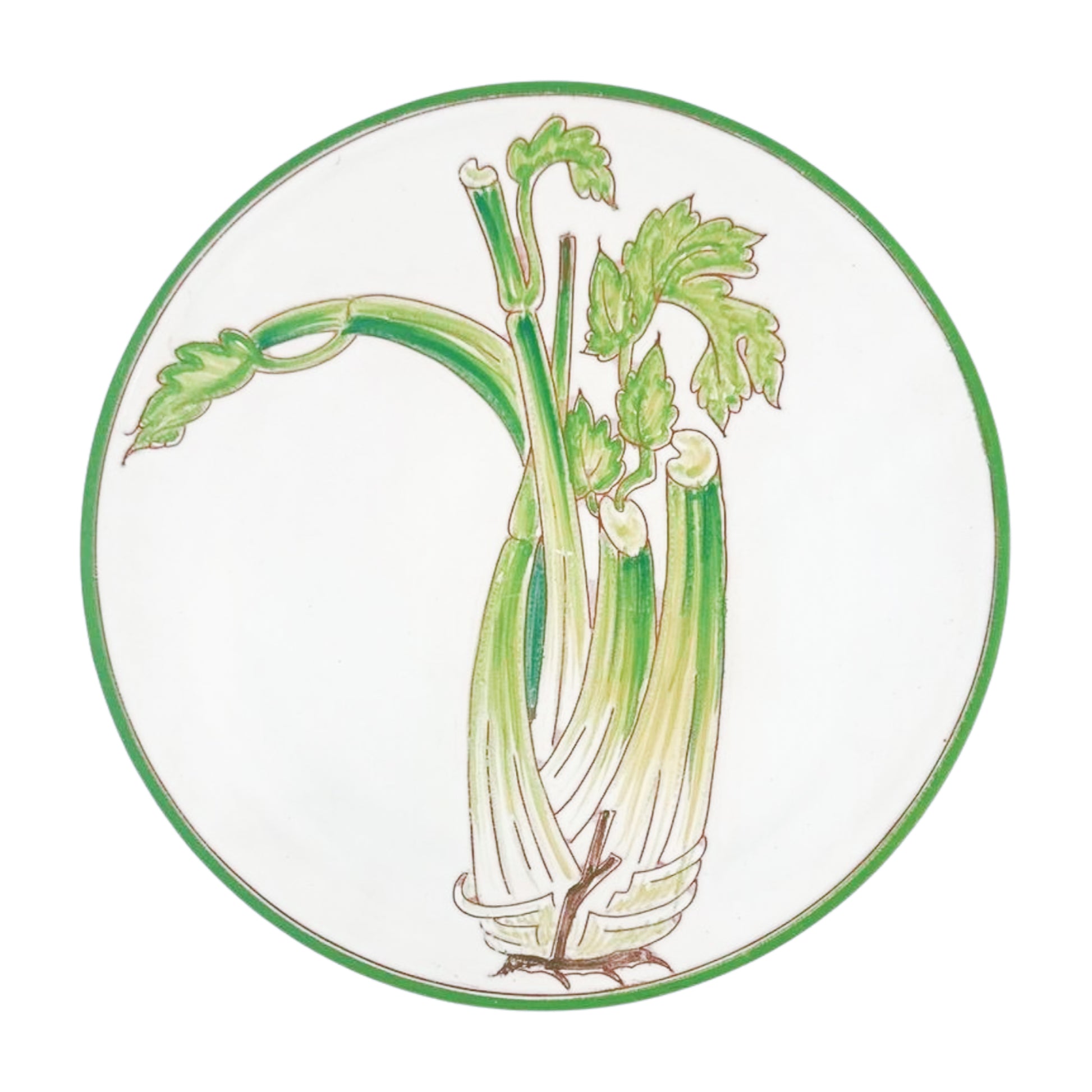 Playful, painterly, and just the right amount of rustic. This set of eight ceramic plates features hand-painted vegetables—from peas and carrots to spring onions and radishes—each bordered with a crisp green rim. Made in Italy, they bring a little irreverence to the table without veering kitsch. Stack them high, or hang them as a series.