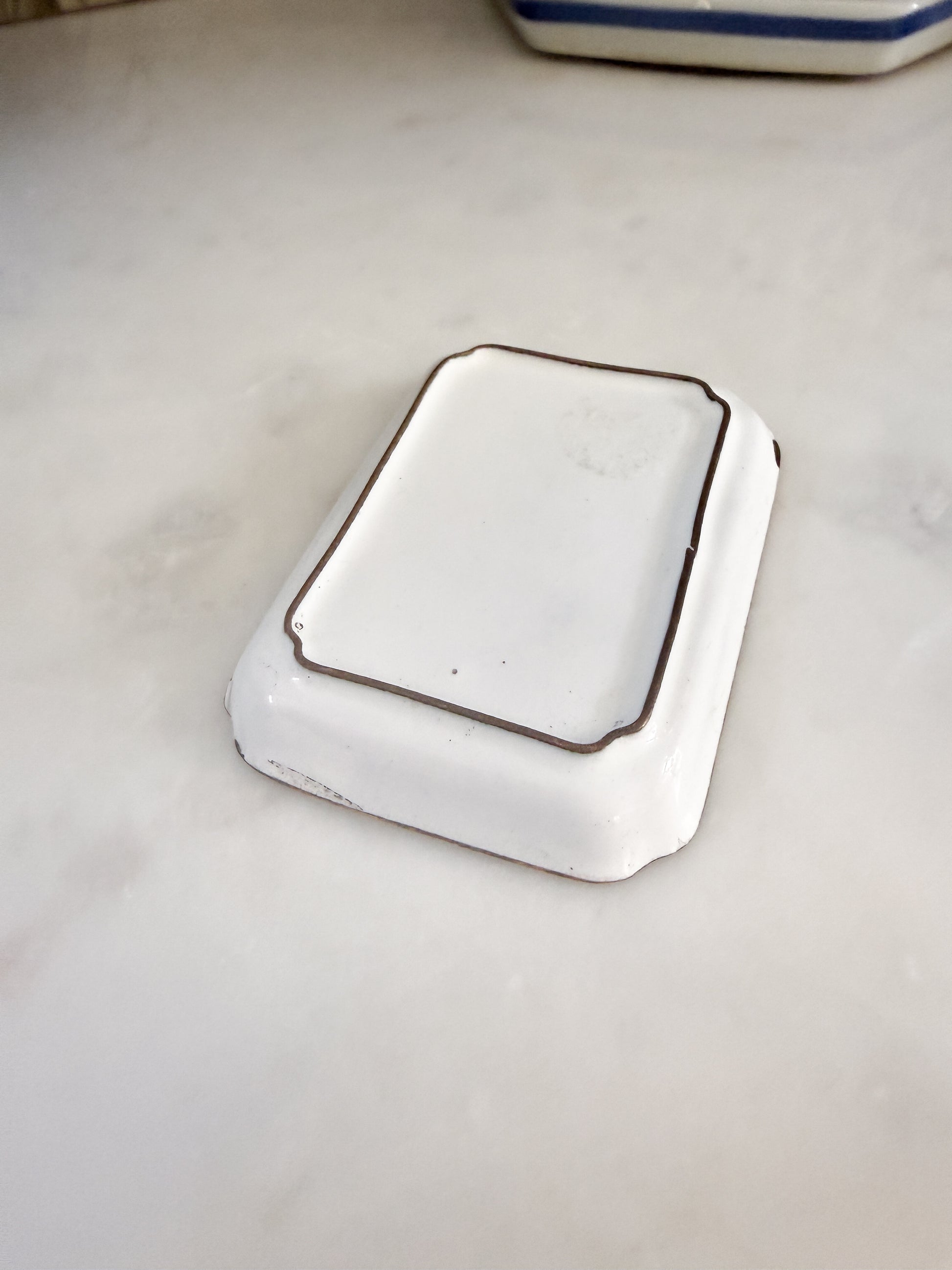 Condition: Beautifully maintained with light, age-appropriate wear consistent with use and history. Small enamel nick to the top left corner (shown) and minor enamel loss to the underside edge; neither detracts from display.