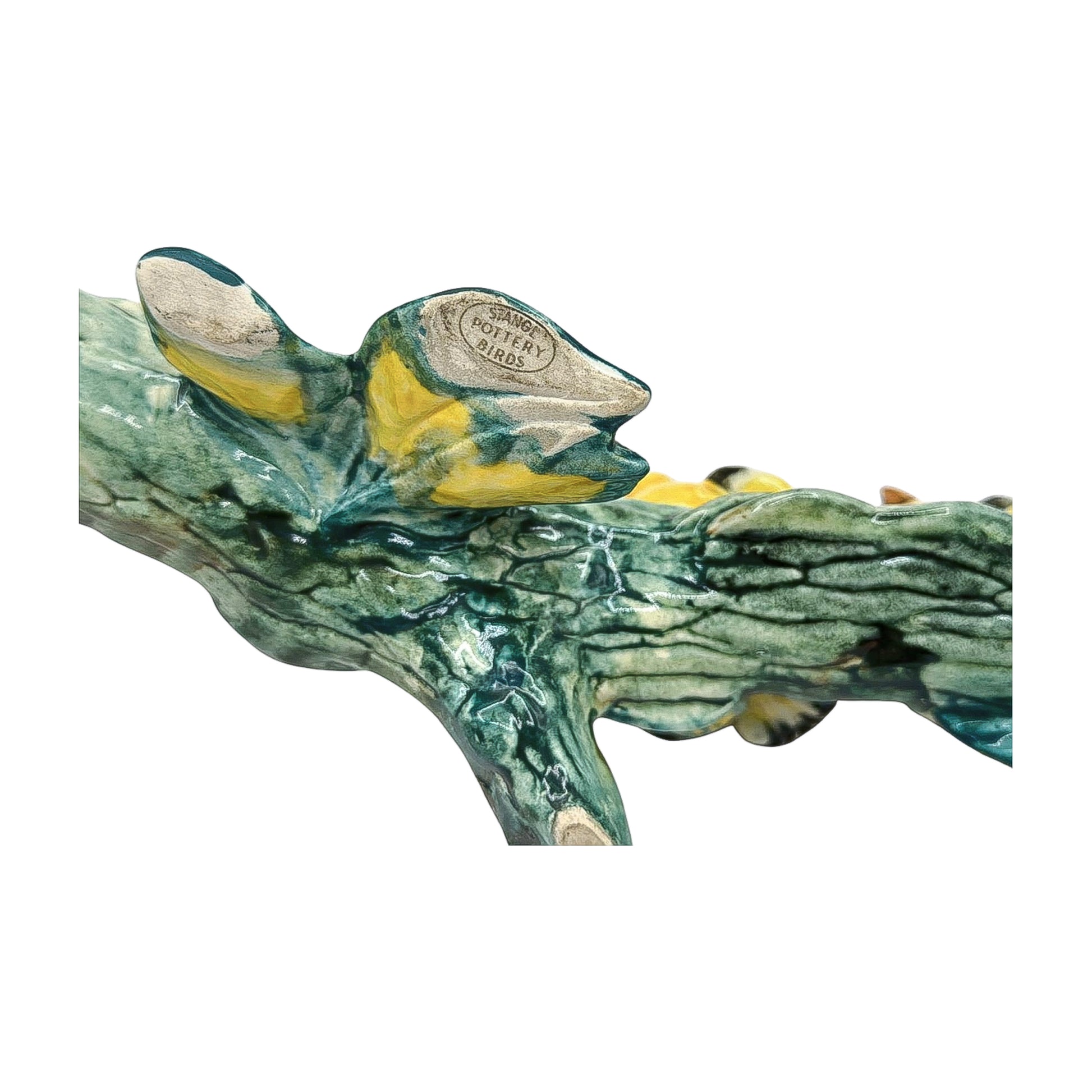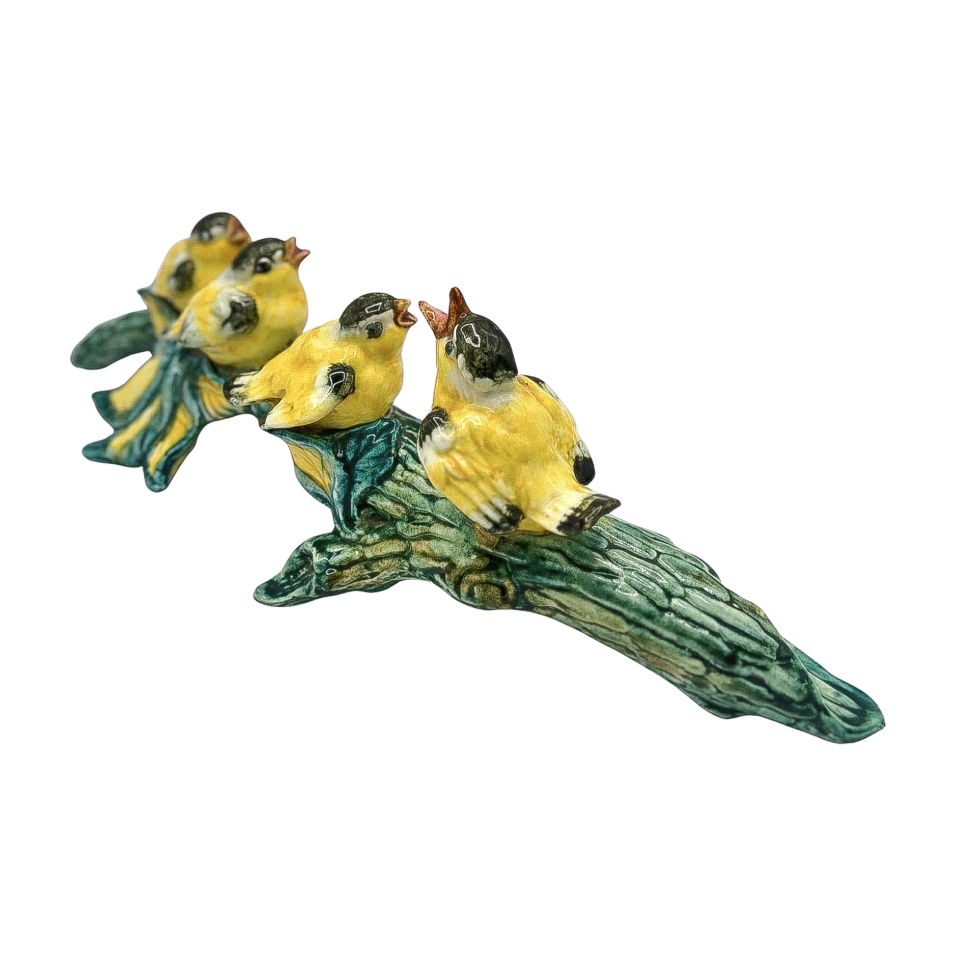 Four little goldfinches on one impossibly charming branch. This hand-painted Stangl ceramic captures a chorus of hungry beaks and fluffy yellow bellies—pure joy in figurine form.