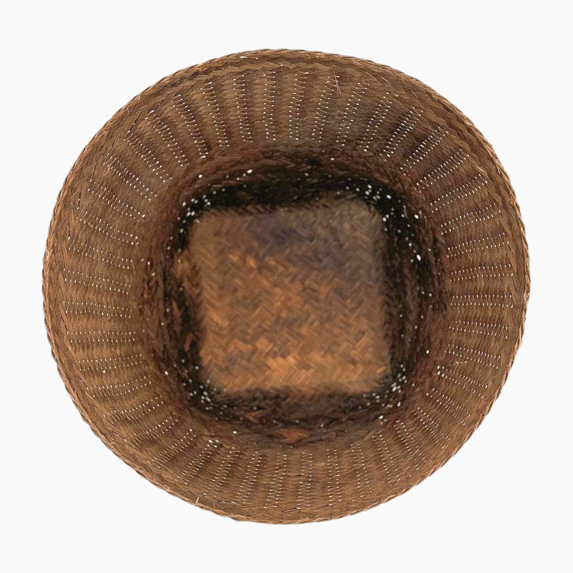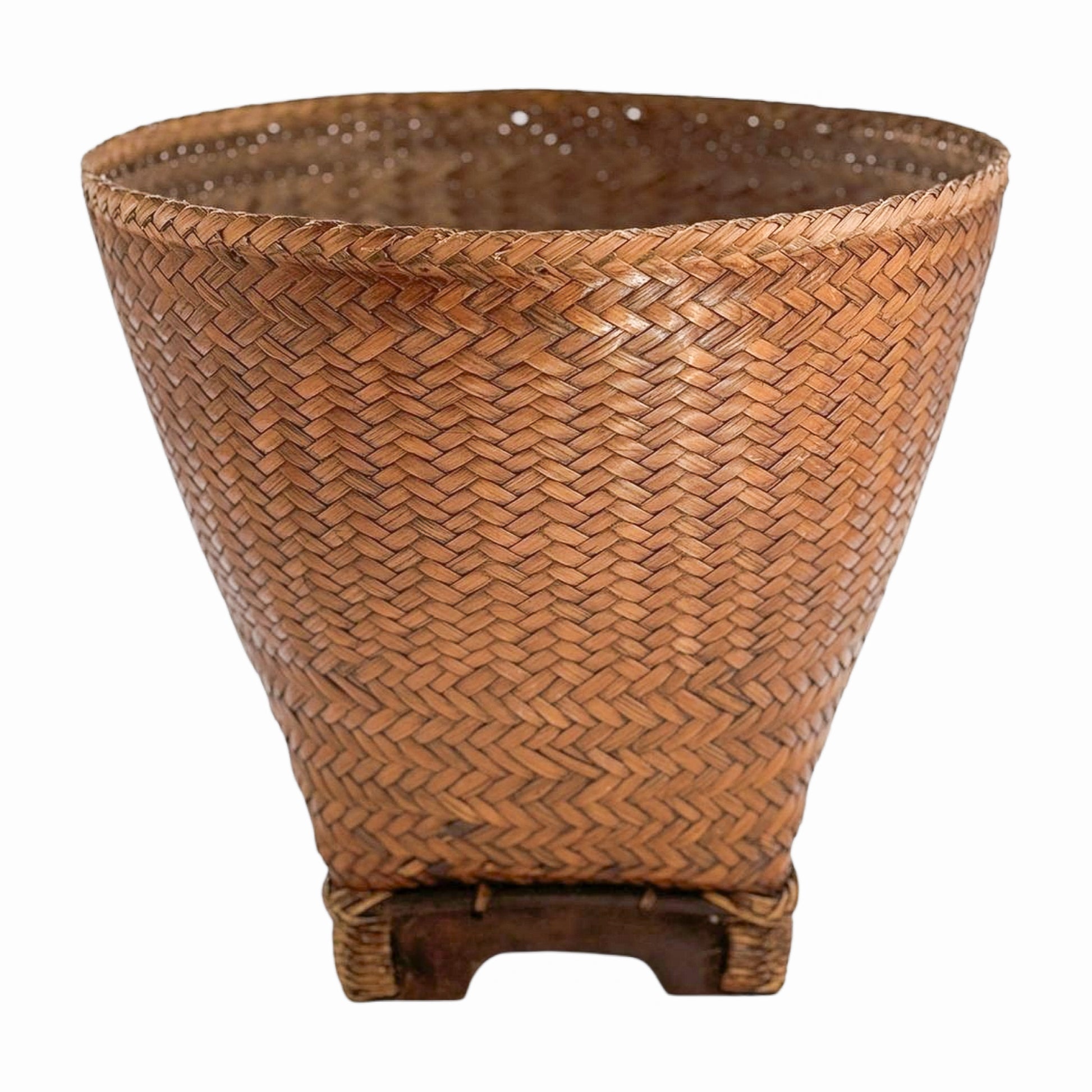 A beautifully tapered silhouette with a tight herringbone weave and dark wooden base. This vintage basket is more sculptural accent than heavy-duty utility—ideal for rolled towels, extra throws, or dried branches. The warm tone and tall profile make it an easy styling piece, whether placed in a bath, beside a sofa, or near the entryway to soften a corner.