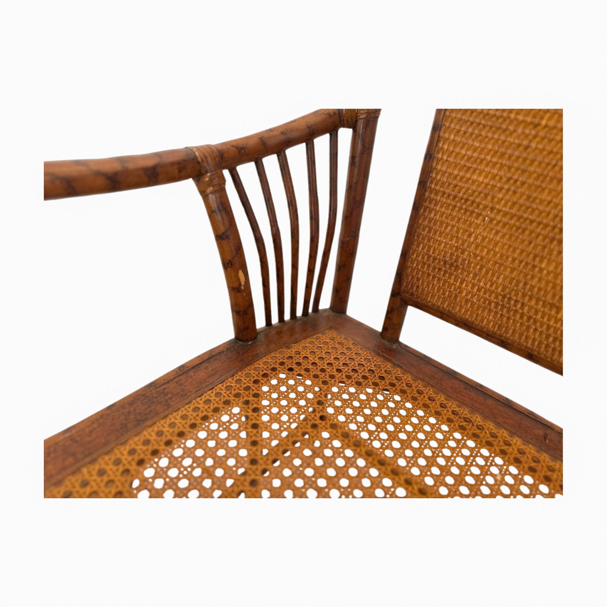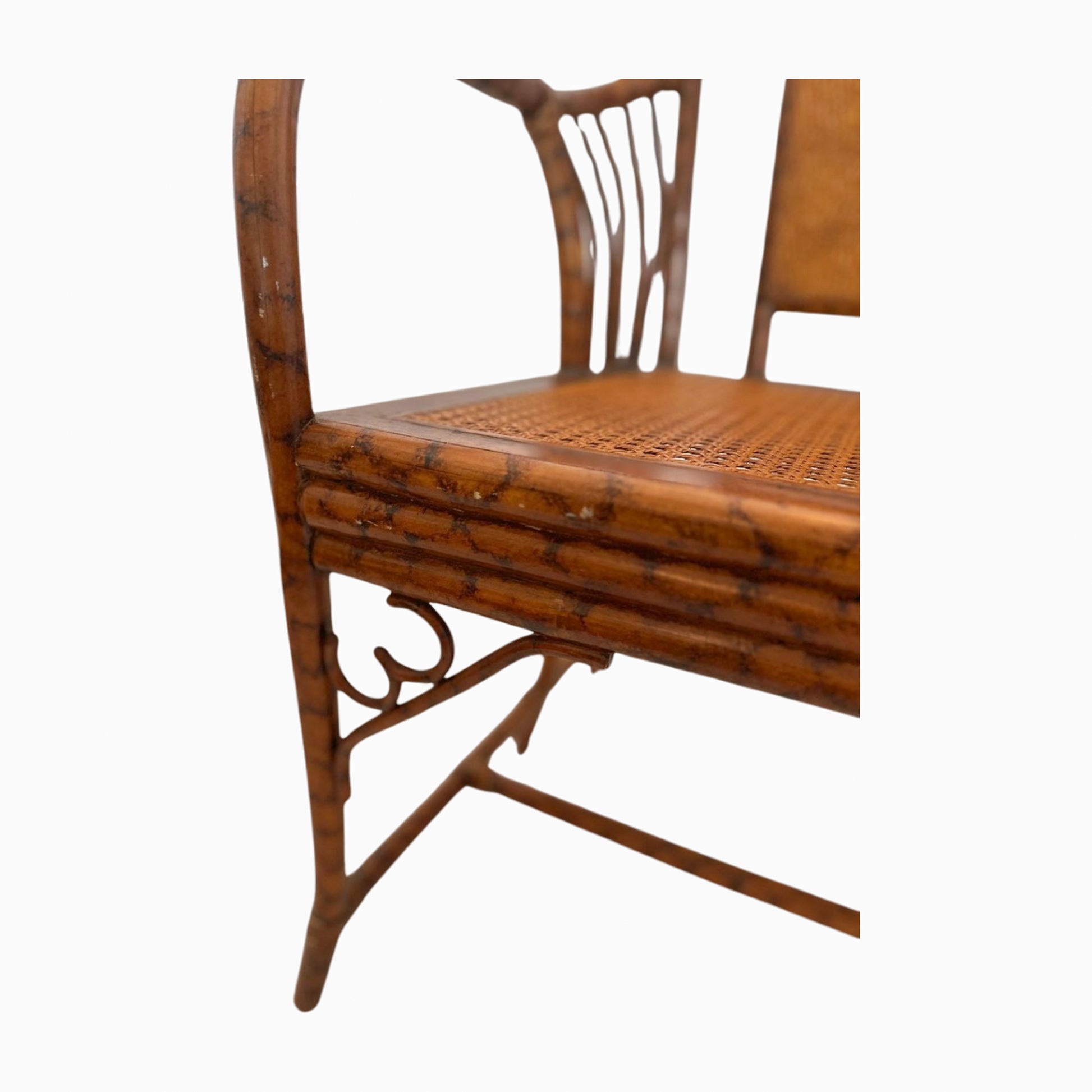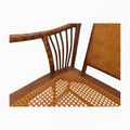 This charming bench features a solid bamboo frame paired with a woven cane seat and a rattan backrest, showcasing a beautiful blend of natural textures. The sturdy bamboo offers structural elegance with its warm, honeyed finish, while the intricately woven cane seat adds timeless character and visual lightness. The smooth, solid rattan backrest creates a refined contrast to the woven elements. Perfect for an entryway, kitchen, mudroom, or any casual living space. Condition is very good, with light wear consistent with age and use, preserving its vintage character.