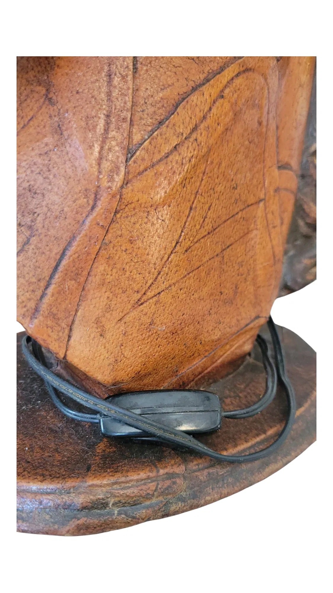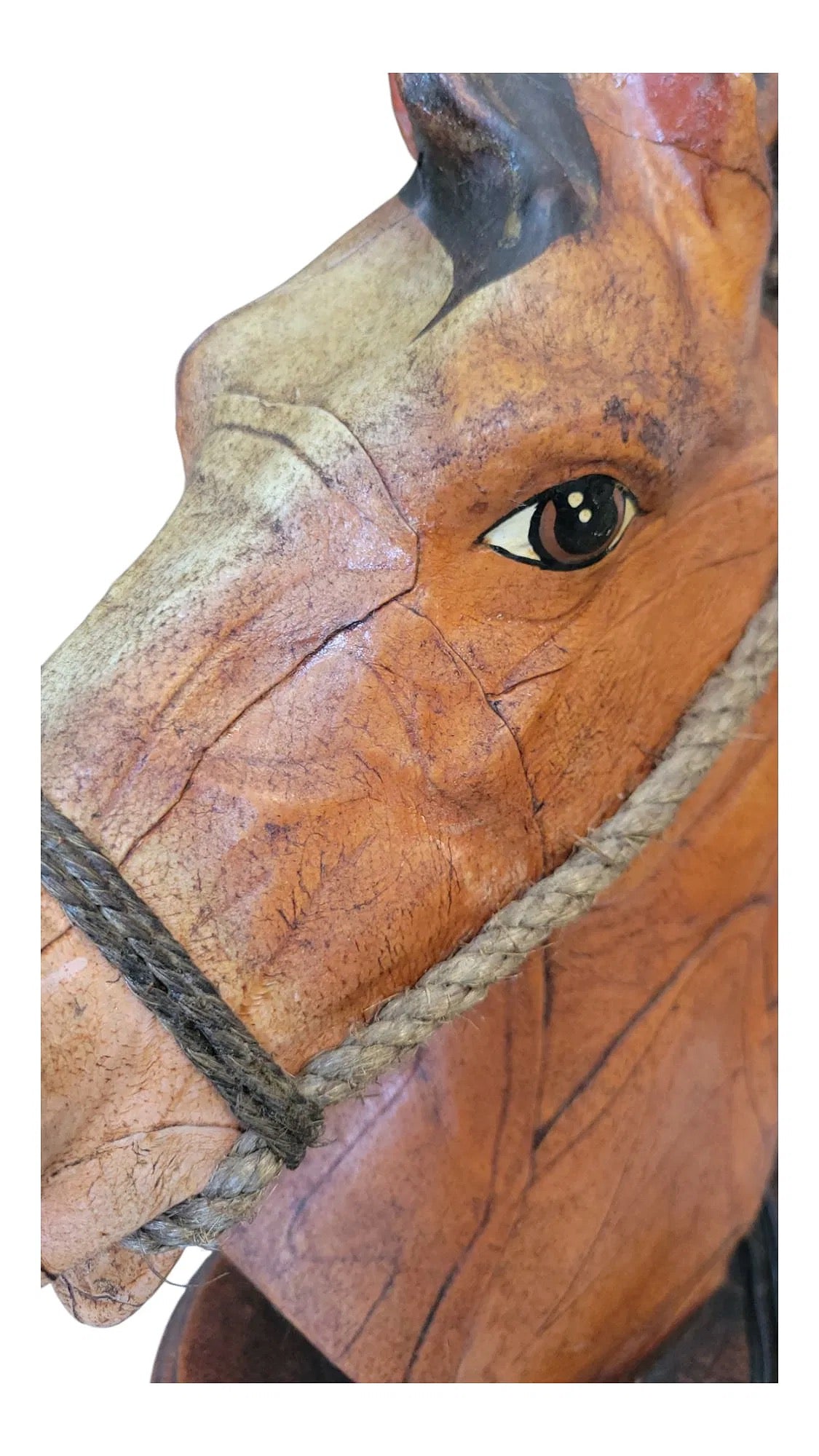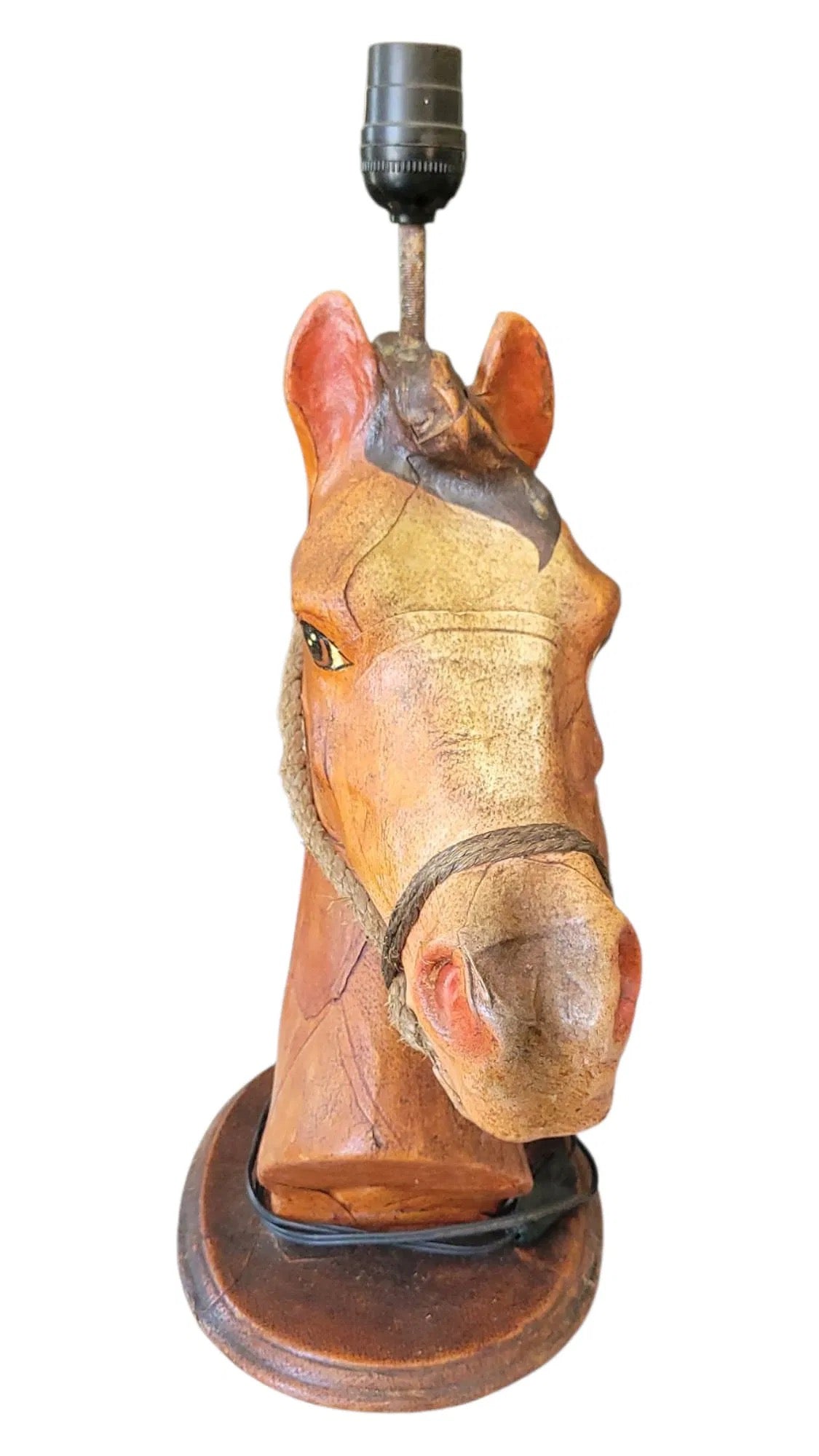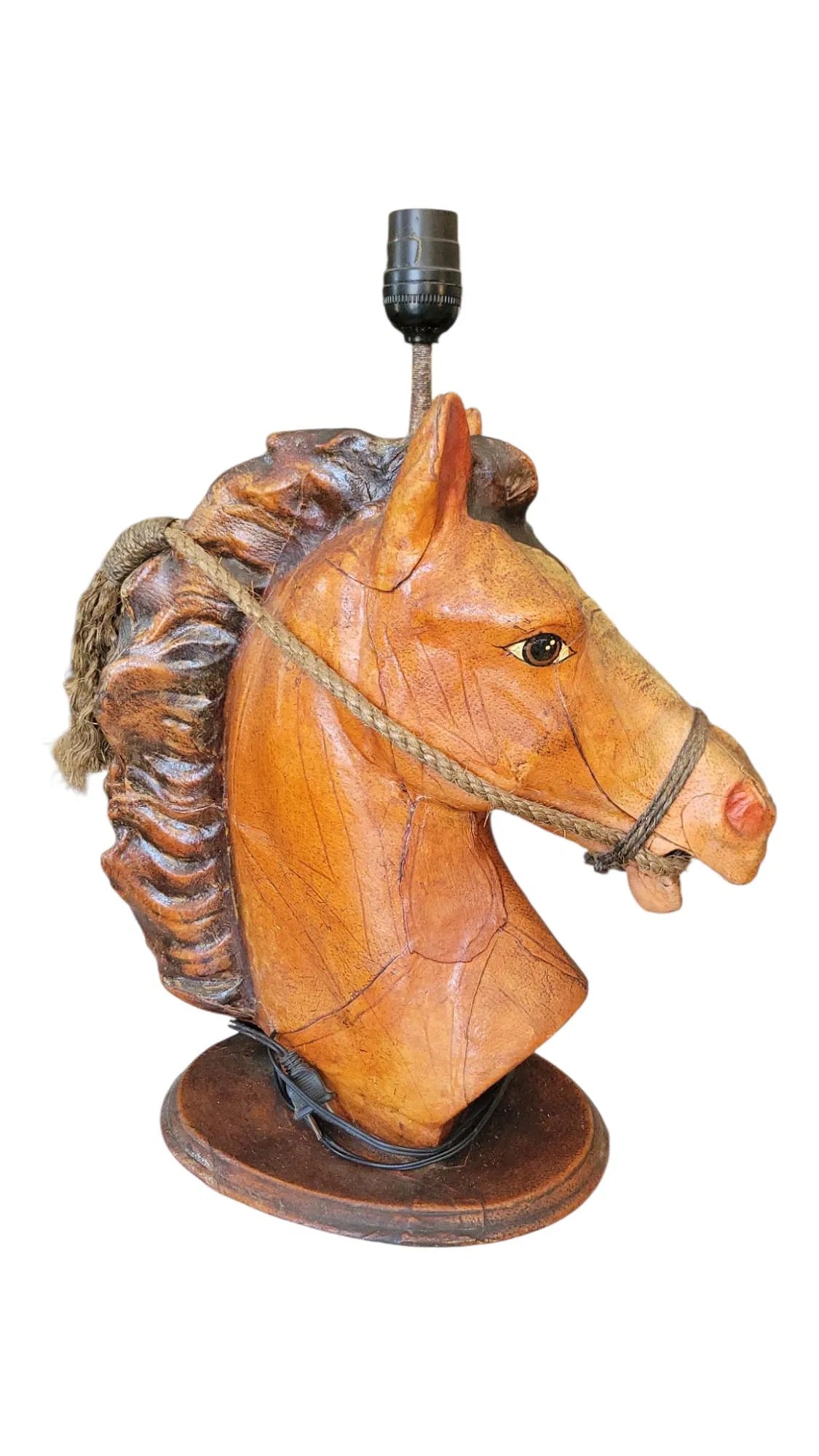 A total scene-stealer, with a perfectly dramatic stare. This vintage hand-molded leather lamp features a stallion bust with roped bridle, detailed eyes, and sculptural presence. Richly textured and full of character, it’s ideal for a library, den, or anywhere that could use a little handsome ruggedness. Giddy-up.