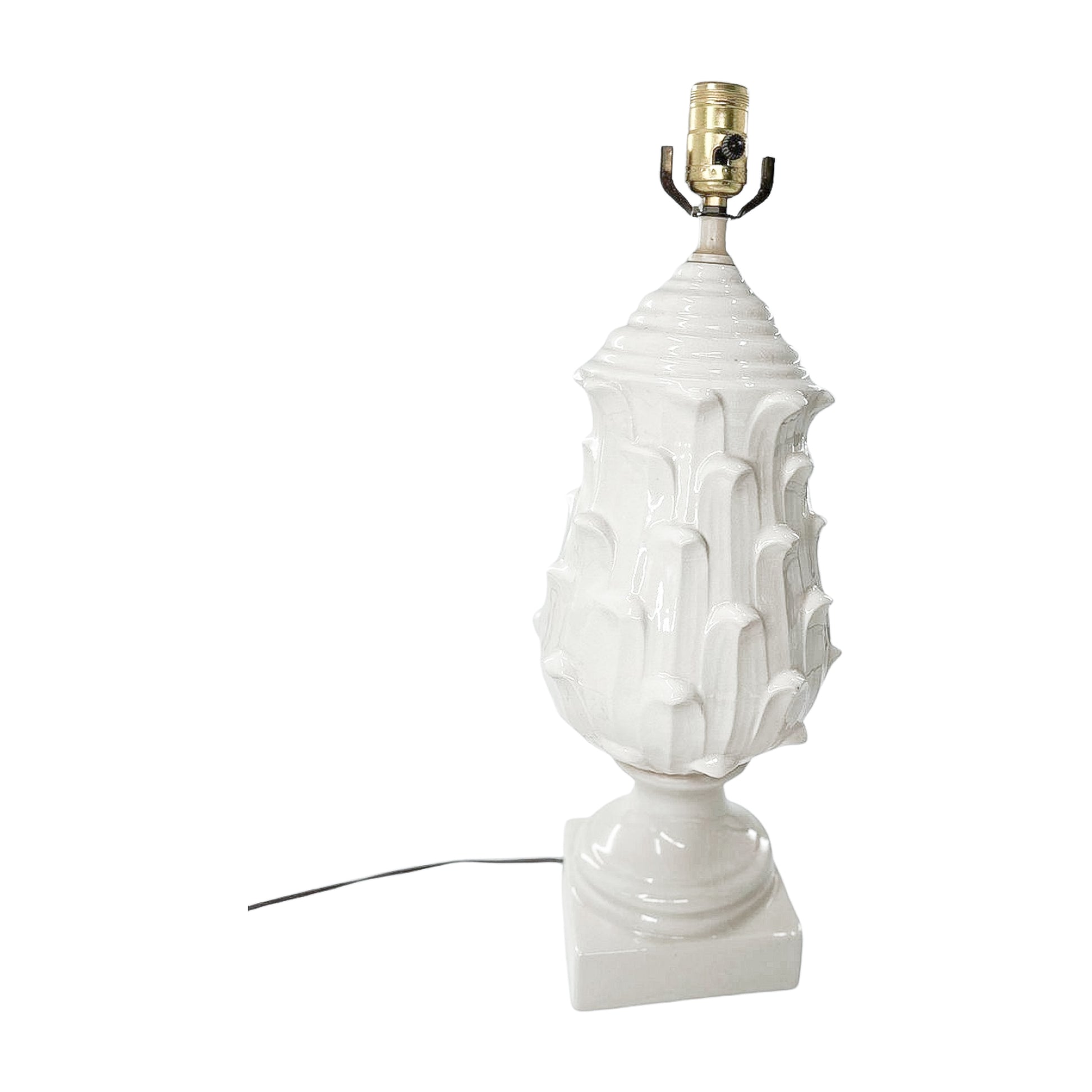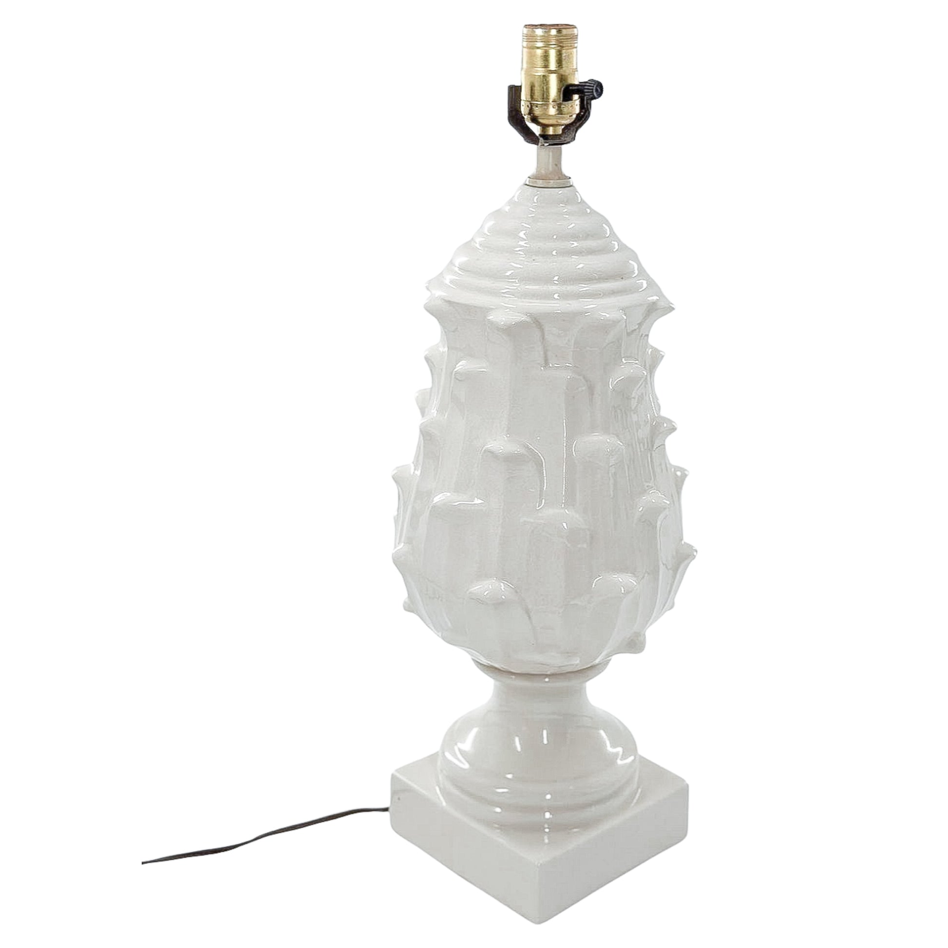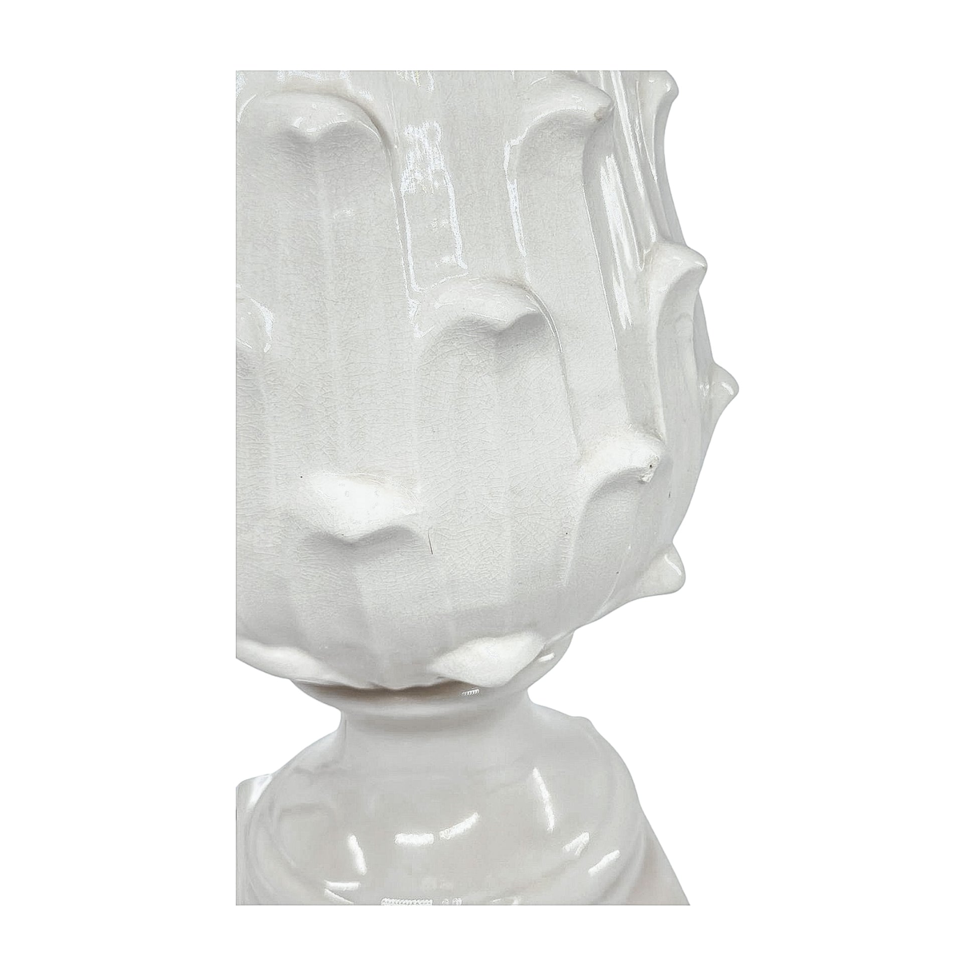 Bold texture meets soft shine. This glossy ceramic lamp features a sculptural artichoke-inspired body, flaring outward in petal-like ridges and perched on a square plinth base. All white, all attitude—and the kind of piece that makes even a corner feel intentional.