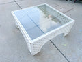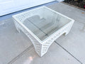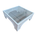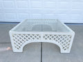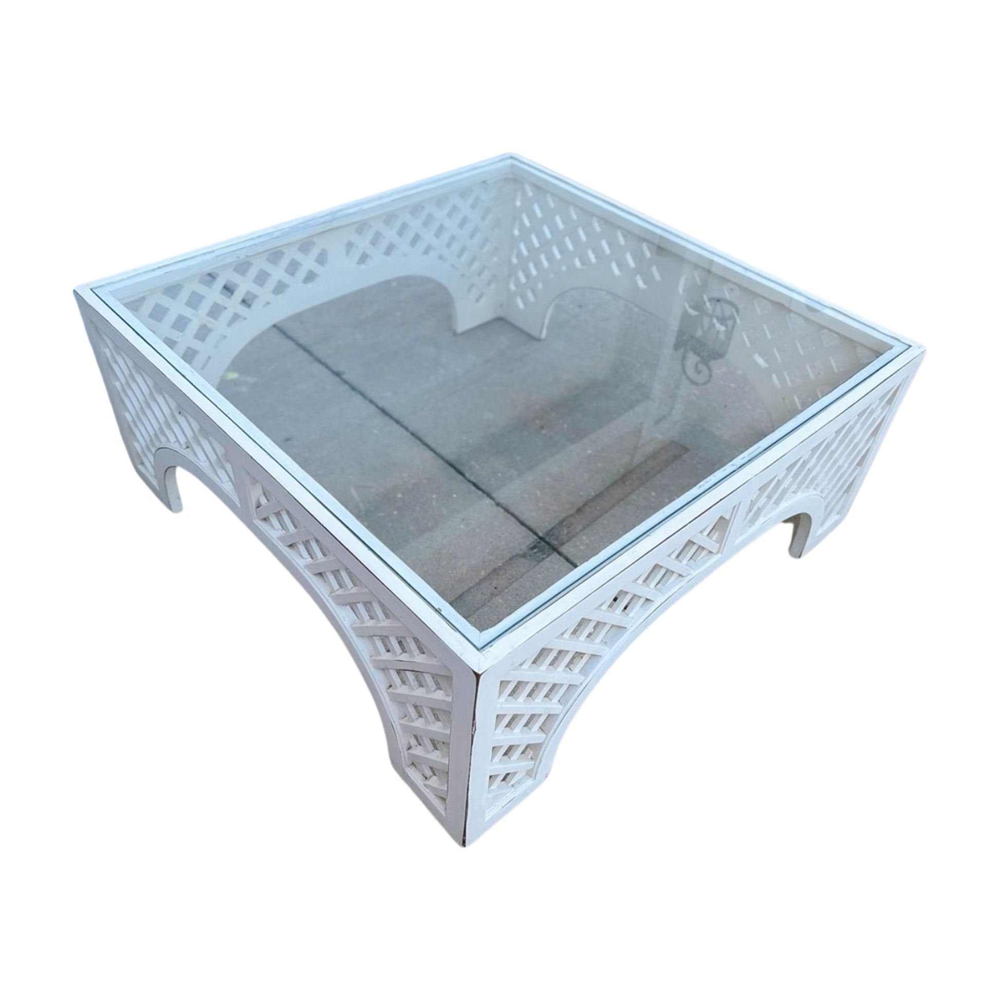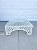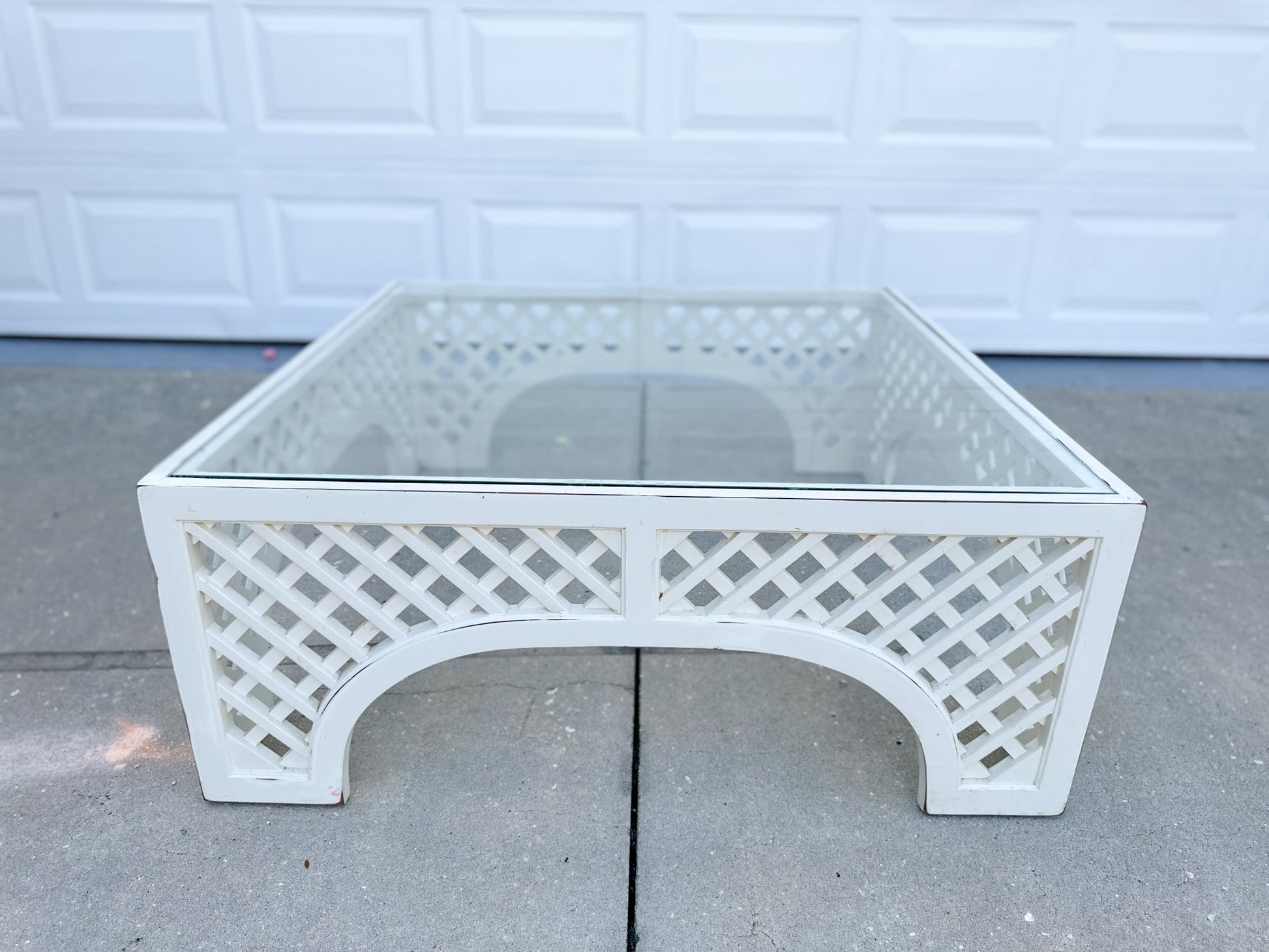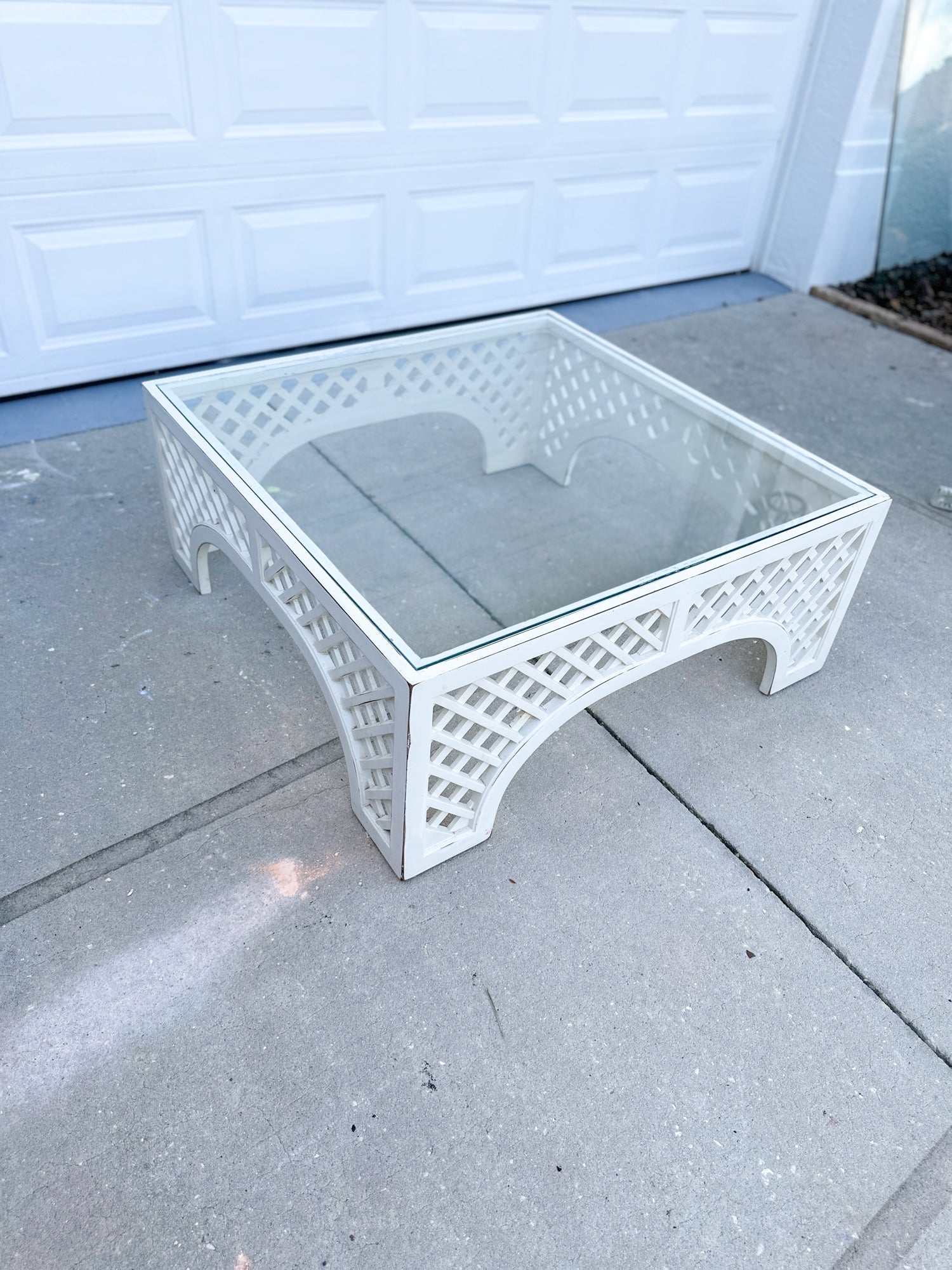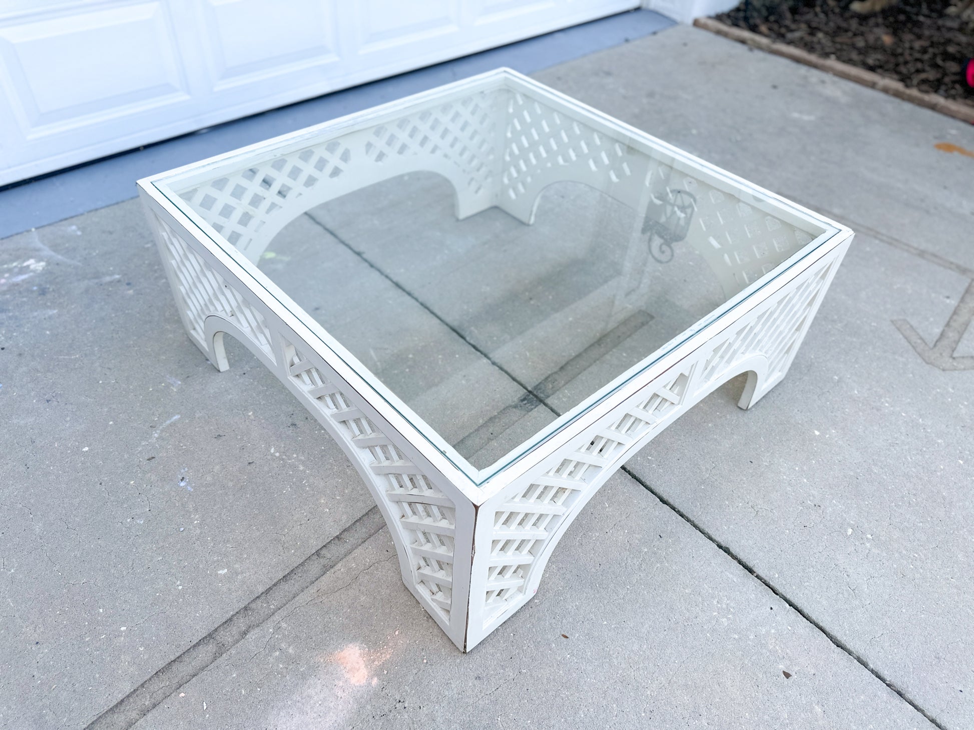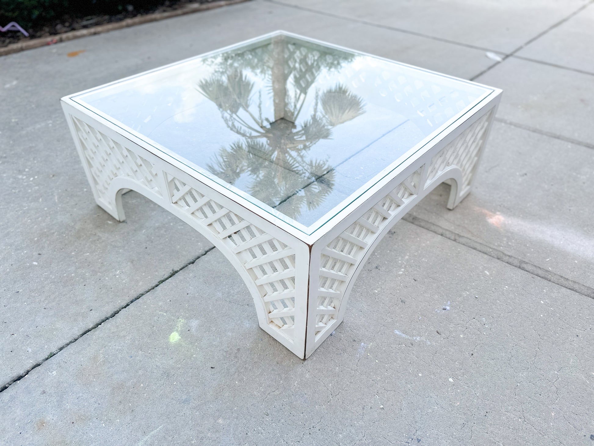 A square frame with a strong point of view. This fretwork coffee table feels like garden trellis meets Palm Beach porch—graphic, architectural, and just relaxed enough. The glass top keeps things light, while the scalloped arches and lattice sides do the heavy lifting in the charm department. A true shape-shifter: crisp against color, coastal with rattan, quietly chic on its own.