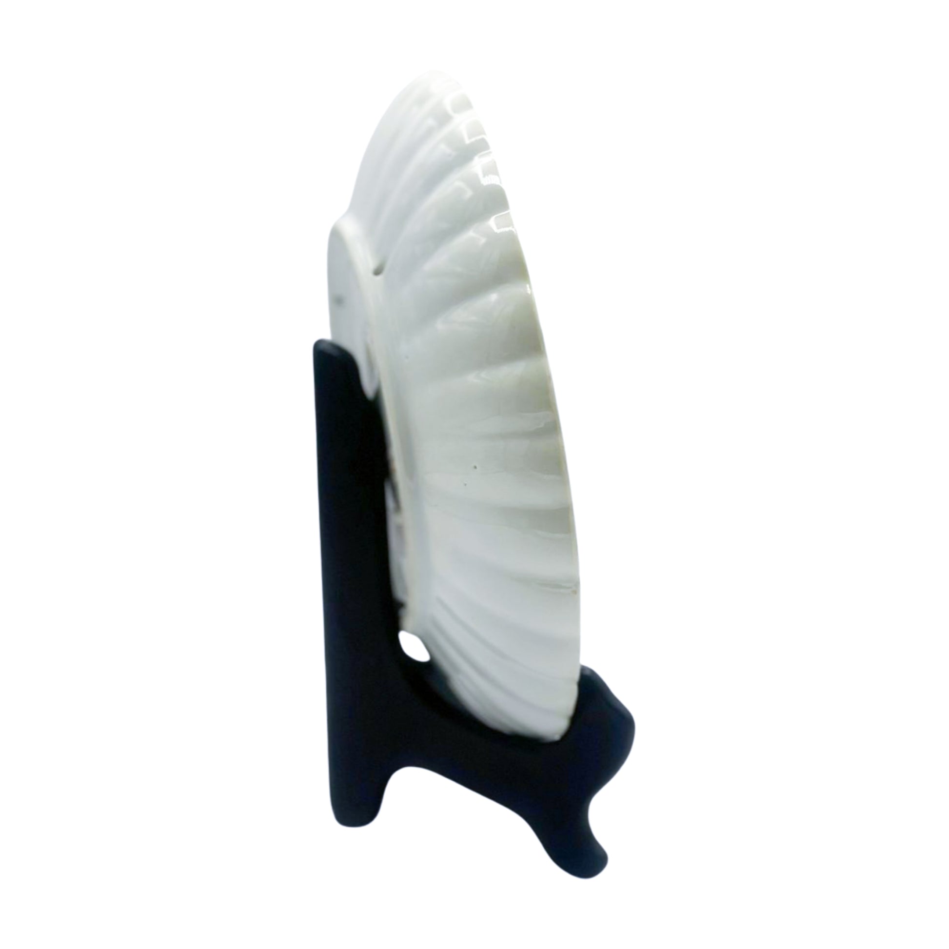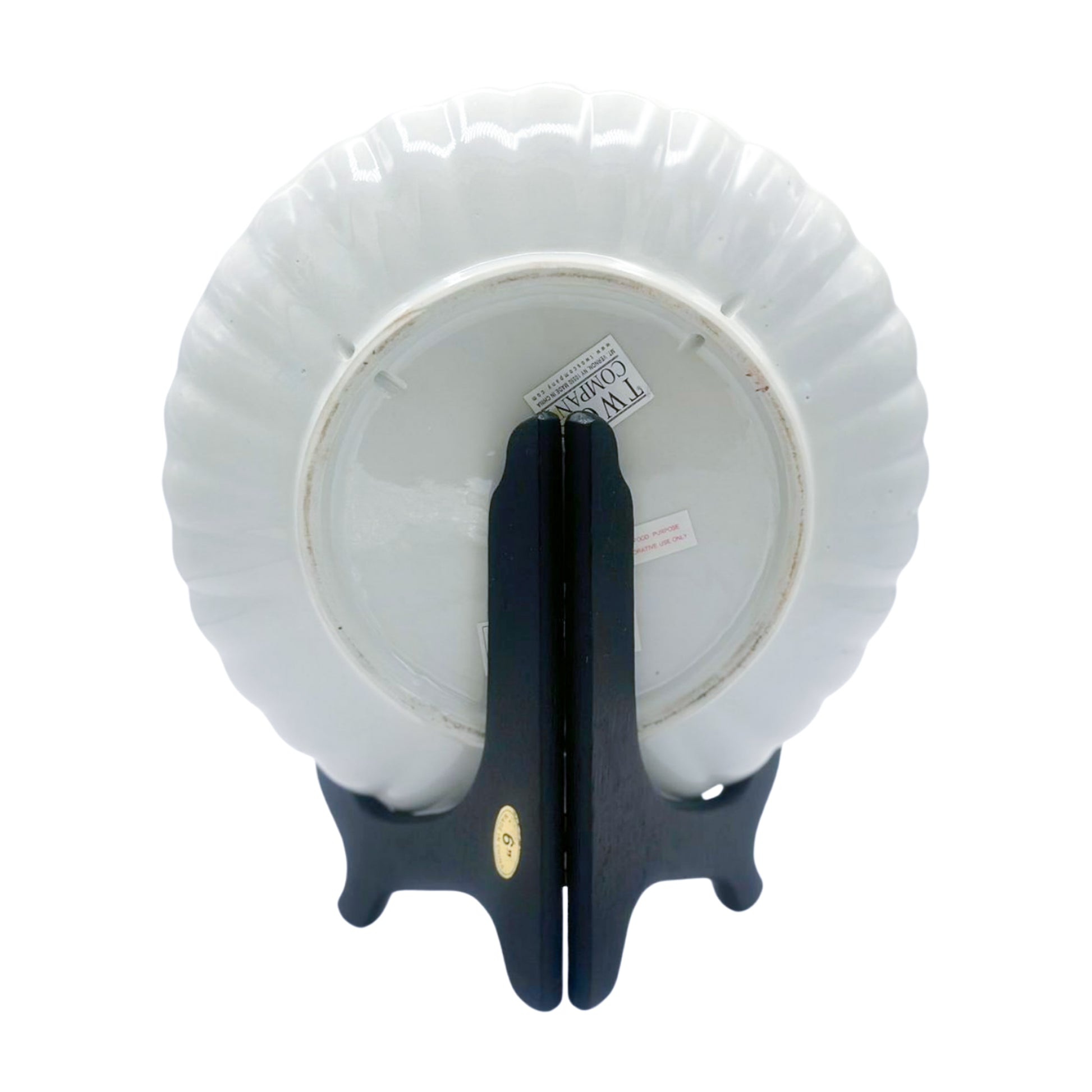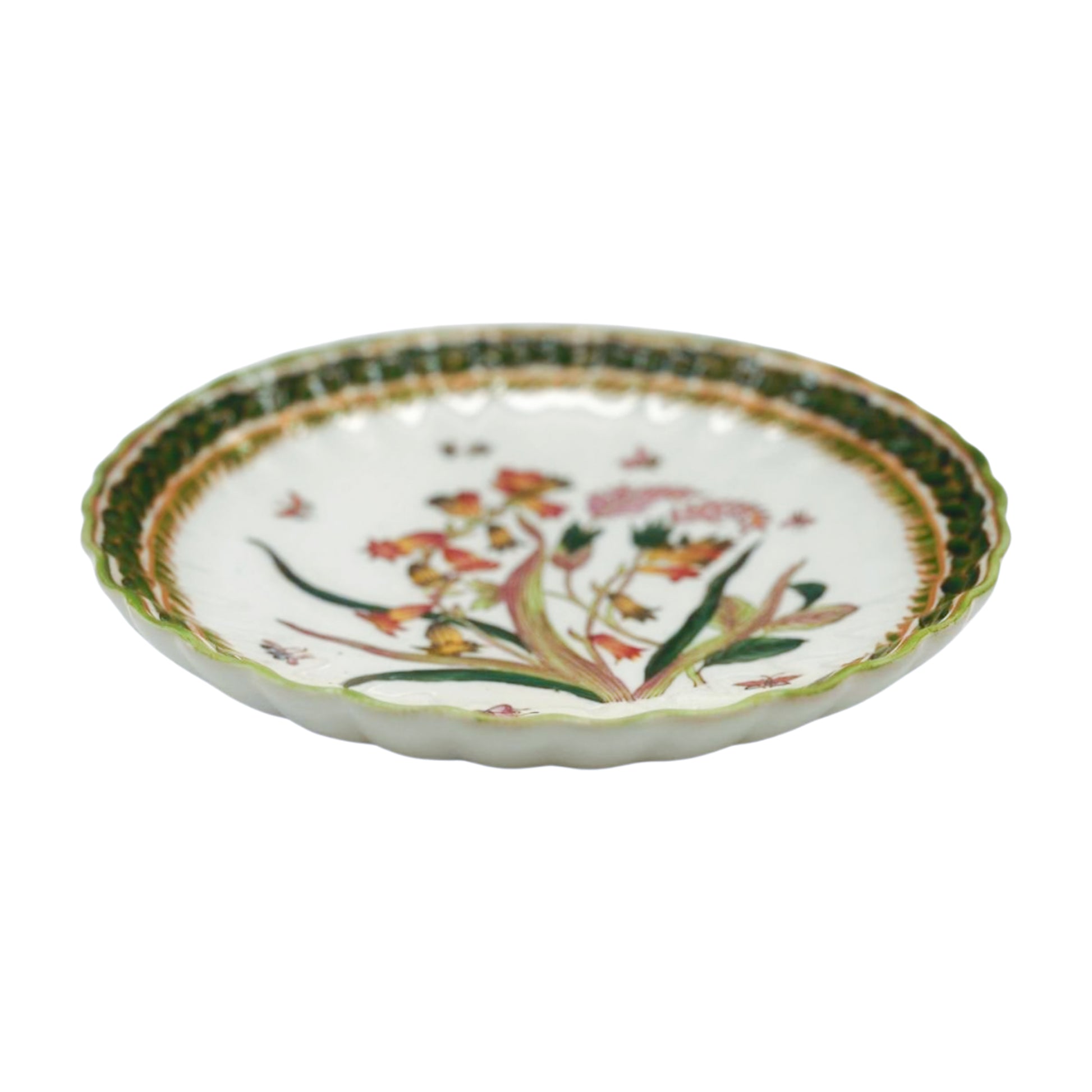 Like a botanical illustration plate come to life. Delicate wildflowers, bees, and tiny red bugs dance across this scalloped-edge dish, trimmed in rich green and gold. Wall-ready or table-worthy.
