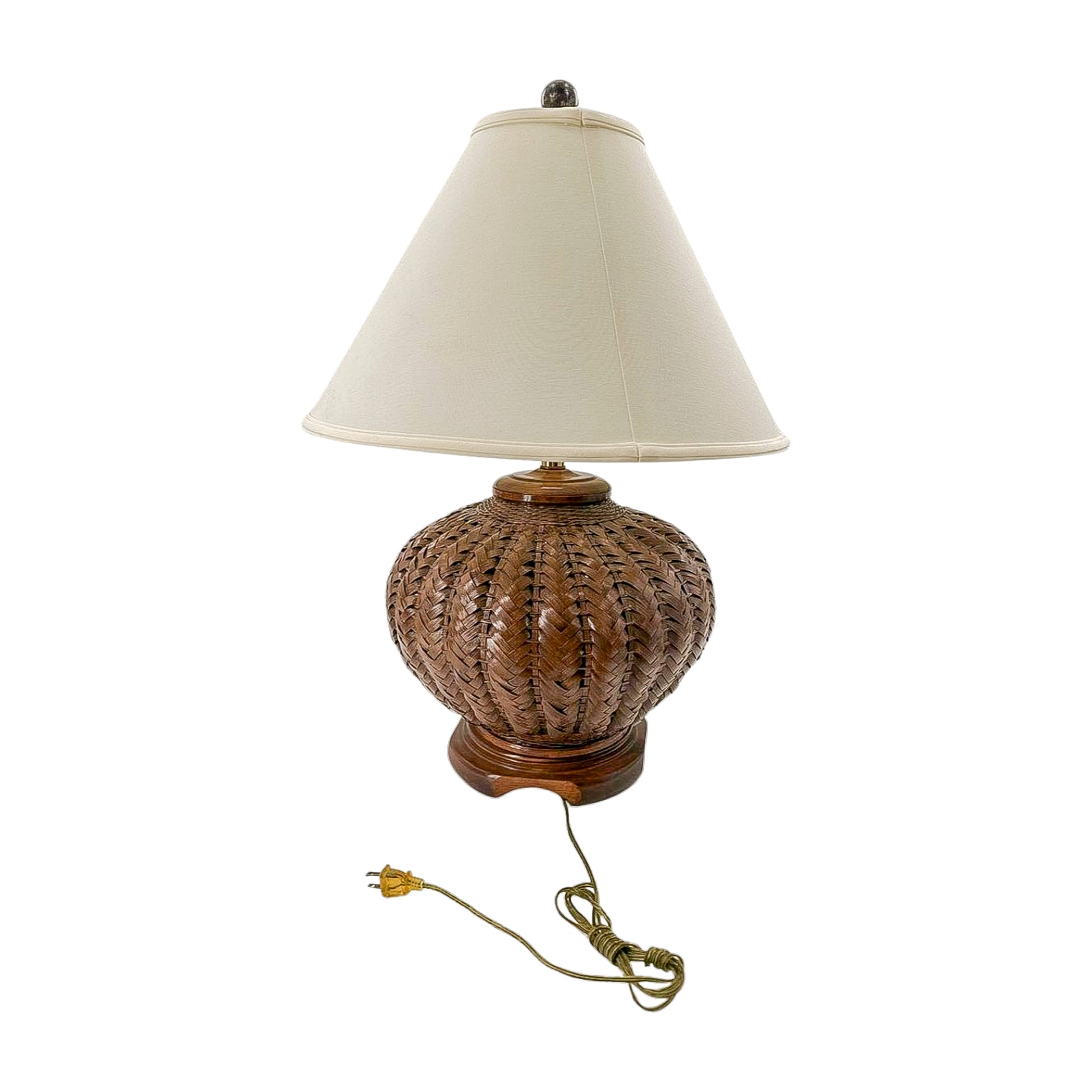 A warm and beautifully textured mid-century table lamp featuring a woven rattan body paired with a polished wood base. These natural materials bring a relaxed, layered feel that effortlessly elevates any space—from living rooms and bedrooms to cozy reading nooks. This rare and unique statement piece blends timeless design with exceptional craftsmanship. In excellent working condition. Though the shade is not included, the lamp does come with the harp, finial, well-maintained cord and switch, ready to add both style and soft illumination to your home.